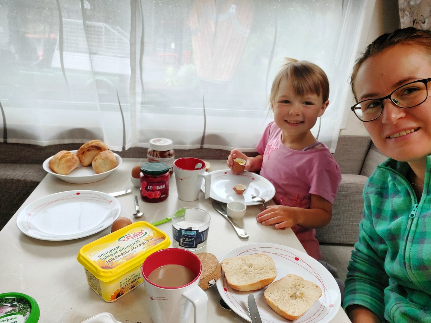 Chris stand kurz nach 7 Uhr auf und startete den Rechner im Vorzelt. Gegen 8 Uhr weckte er uns, und wir genossen ein leckeres Frühstück zusammen.