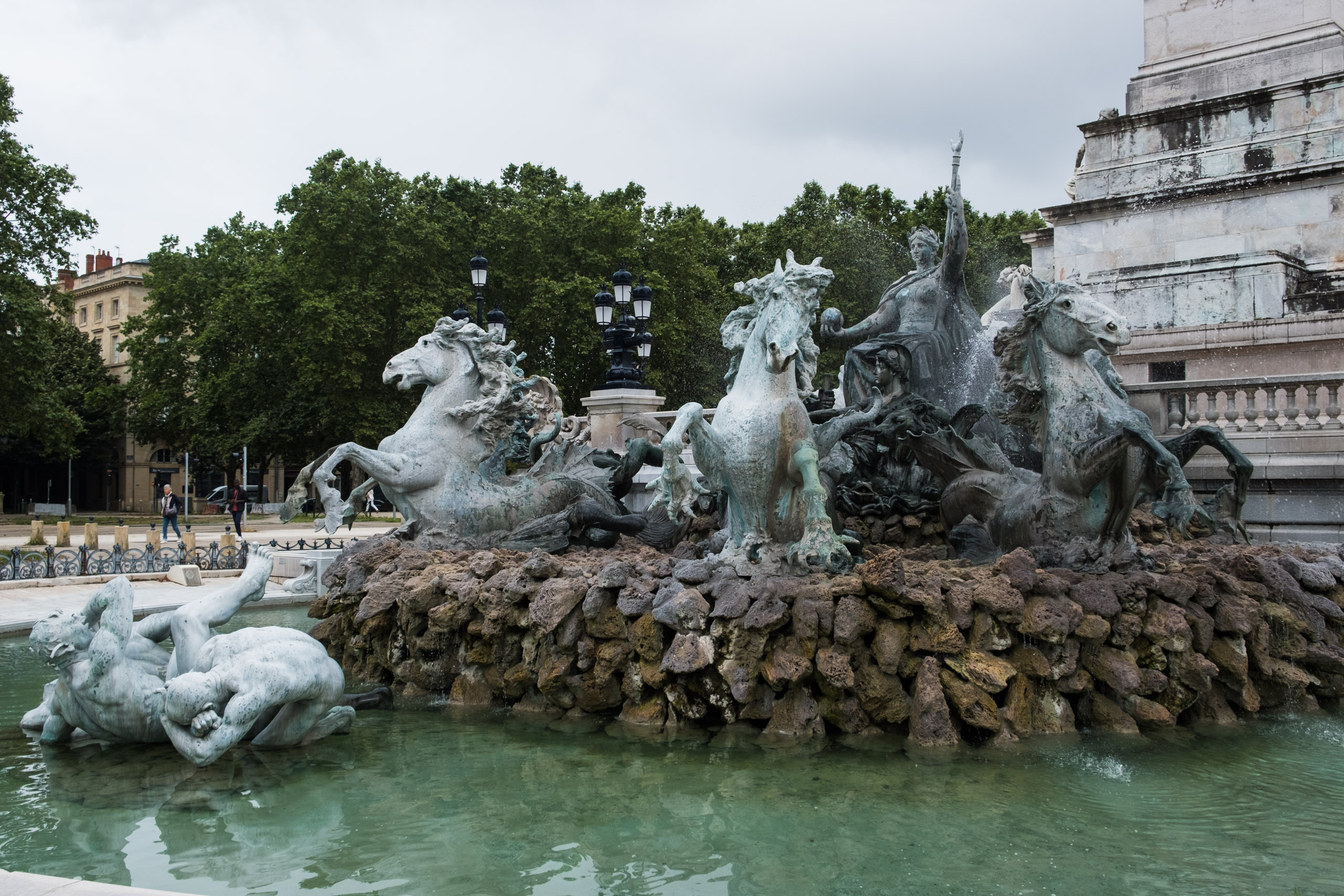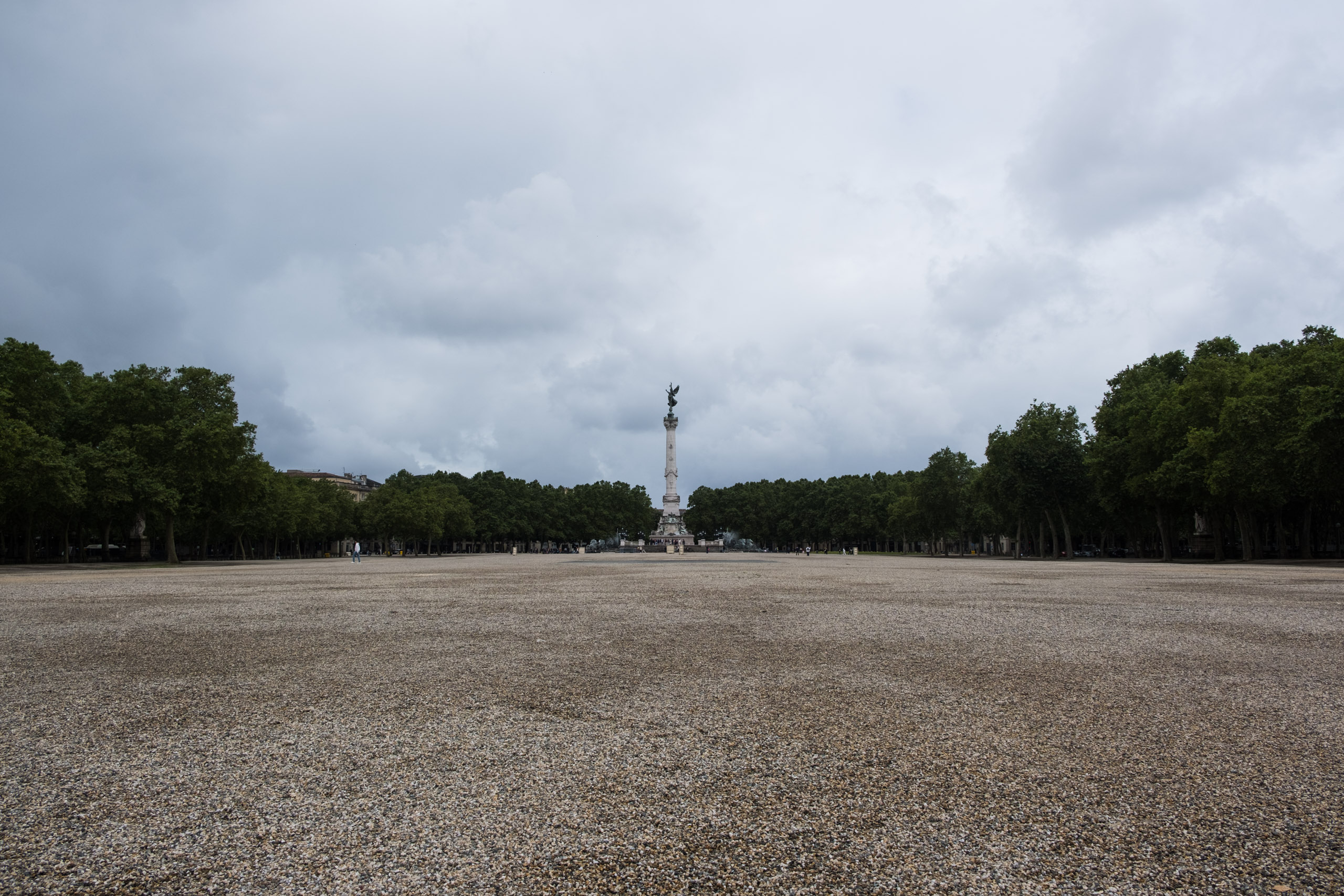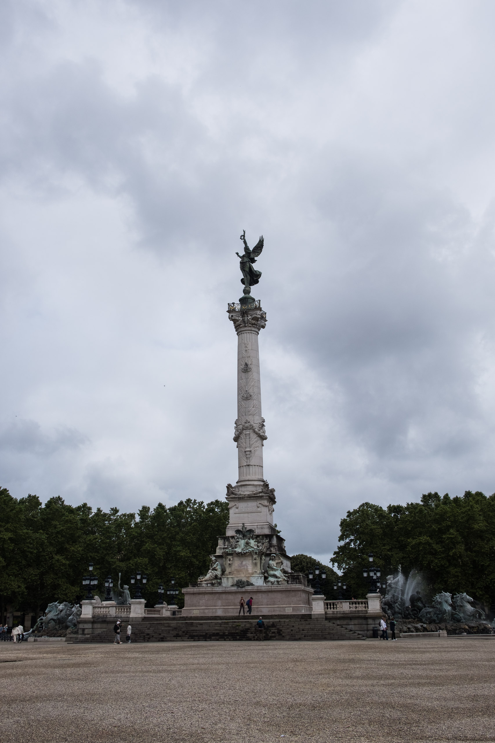 Der Platz, einer der größten in Europa, beeindruckt durch seine Weitläufigkeit und die majestätischen Statuen des Denkmals, das den Girondisten der Französischen Revolution gewidmet ist, sowie den imposanten Brunnen.