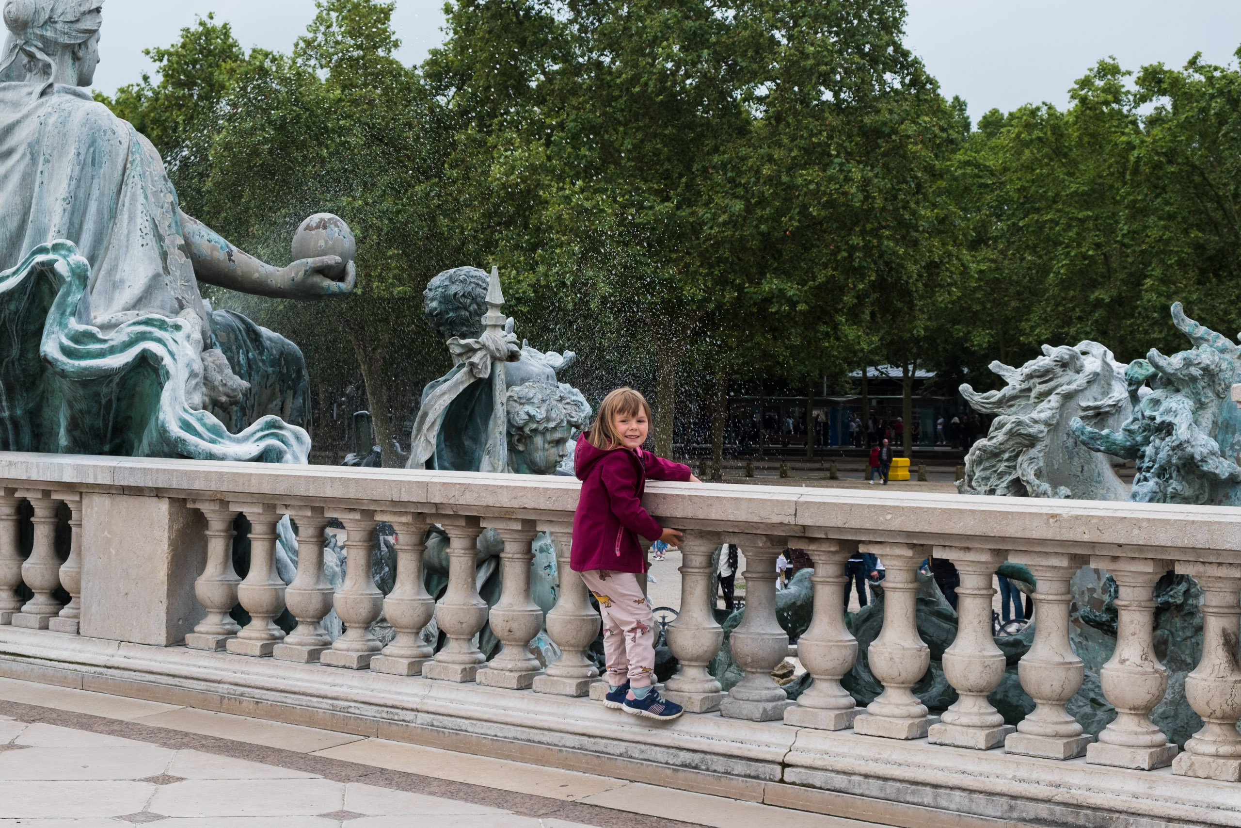 Der majestätische Brunnen in der Mitte und die spiegelnde Wasserfläche des Miroir d’eau, die größte Wasserspiegelanlage der Welt, ziehen sofort alle Blicke auf sich.