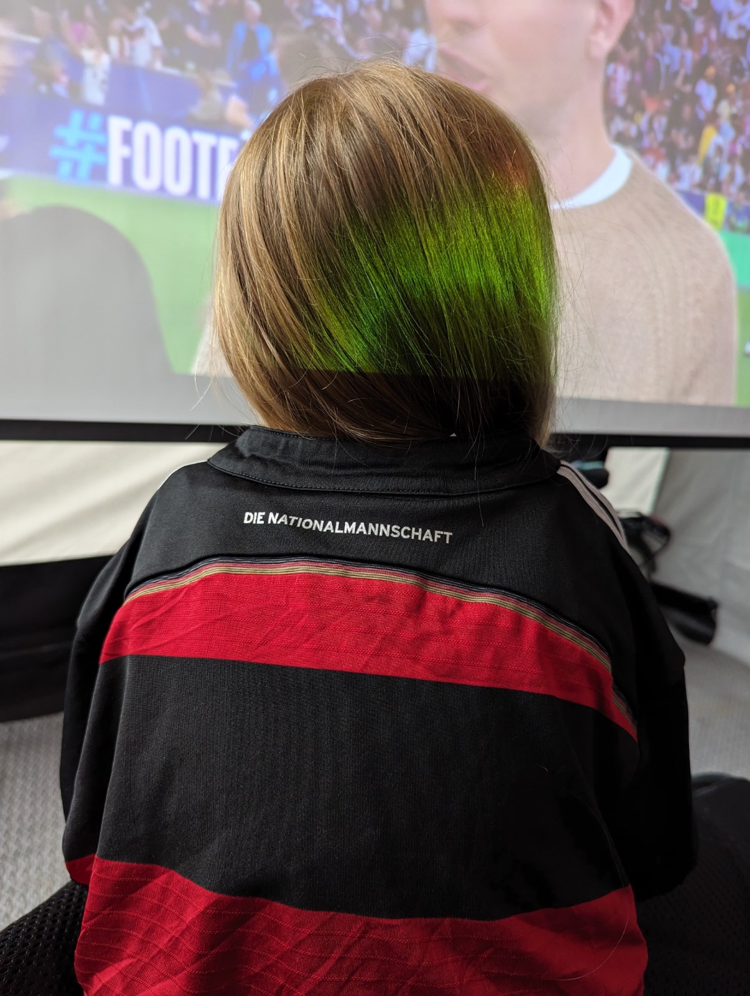Am Abend stand die Europameisterschaft 2024 mit dem Eröffnungsspiel der deutschen Mannschaft gegen Schottland auf dem Programm. Wir schauten das Spiel auf dem Beamer im Vorzelt. Der Regen hörte pünktlich zum Anpfiff auf, was uns sehr freute. Sammy durfte natürlich die erste Halbzeit mit anschauen. Für sie war jedoch die Tanzeinlage zur Eröffnungsfeier viel interessanter als das eigentliche Spiel.