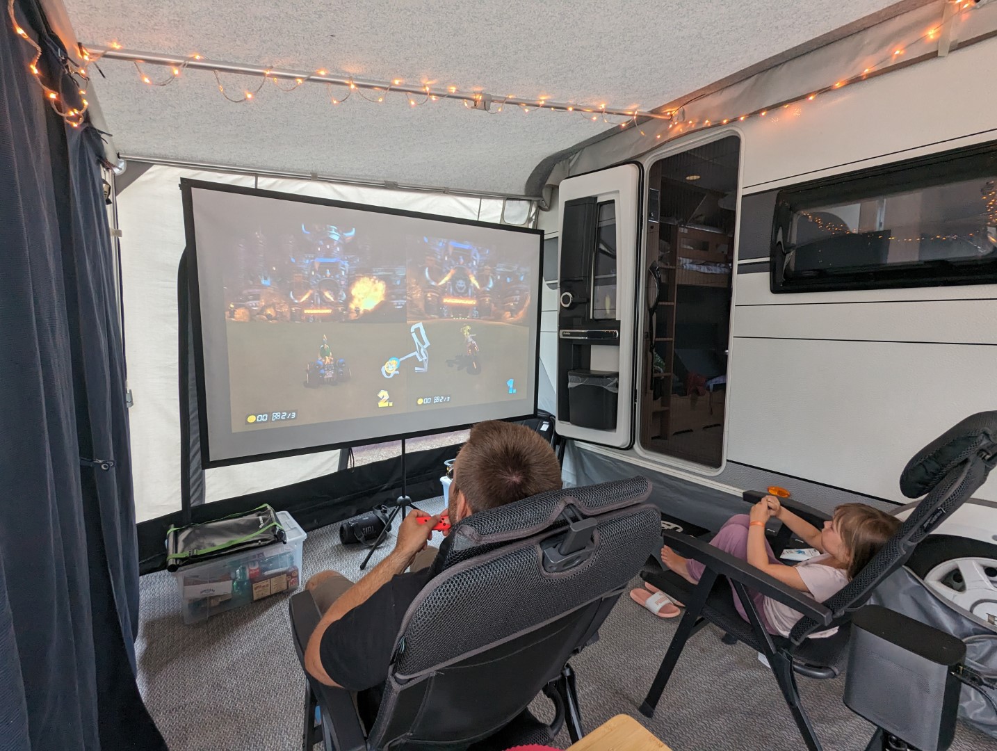 Abends standen wir mit den Eltern und den Kindern bei einem Getränk rund um die Wohnwagen und sprachen über allerlei „Camper-Dinge“. Es war schön, sich auszutauschen und die Gemeinschaft zu genießen. Da der Beamer noch für Fußball aufgebaut war, nutzten Sammy und Chris die Möglichkeit, sich auf der Rennstrecke zu messen. Sammy gewann natürlich den Grand Prix mit 3 zu 1 und strahlte über das ganze Gesicht.