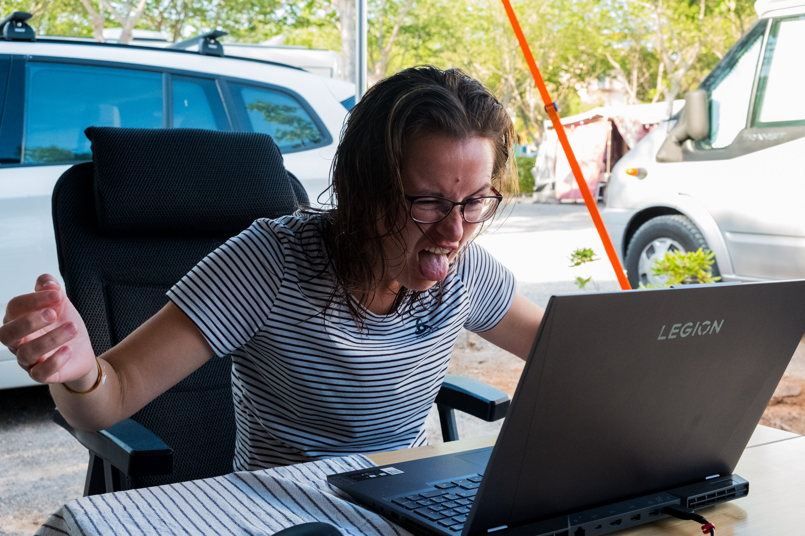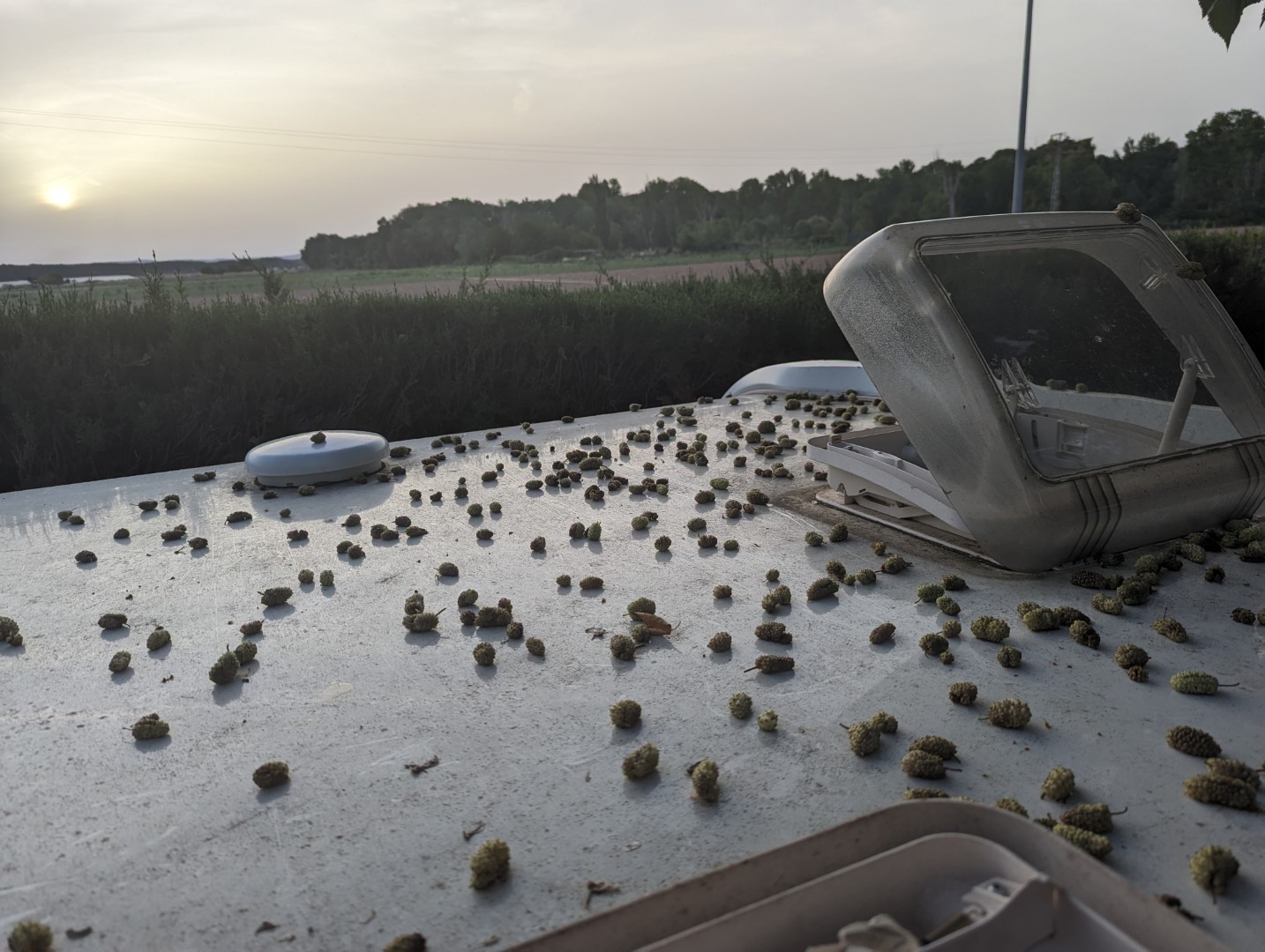 Schon während des ersten Tages war uns klar, dass der Wohnwagen und das Vorzelt schlimm aussehen würden. Der Campingplatzbetreiber hatte aus uns unbekannten Gründen entschieden, auf jeden Stellplatz einen Baum mit klebrigen und weichen Früchten hinzustellen. Diese Früchte lagen nicht nur um den Wohnwagen verteilt, wo man ständig hineintrat und sie ins Vorzelt brachte. Nein, sie lagen auch auf dem Vorzelt und dem Wohnwagen. Bei stärkerem Wind hörte es sich jedes Mal wie ein Hagelschauer an. Beim Abbau mussten wir natürlich versuchen, diese Früchte so gut es ging vom Vorzelt und Wohnwagen zu entfernen. Das erschwerte den Abbau ungemein und sorgte für reichlich Frustration.