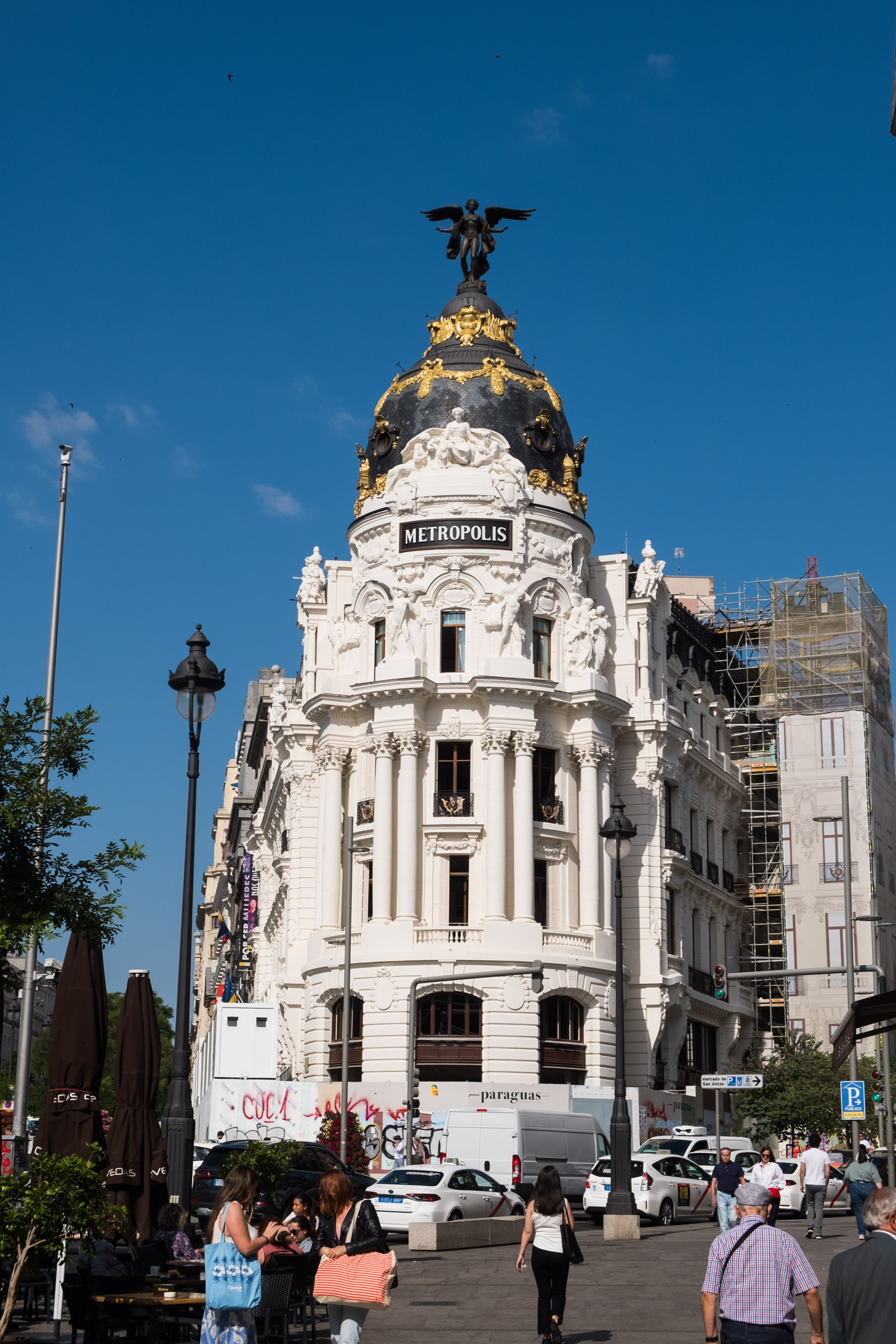 Das “Edificio Metrópolis” beeindruckte uns mit seiner prächtigen Kuppel und den aufwendigen Skulpturen. Es ist eines der bekanntesten Gebäude an der Gran Vía und ein Paradebeispiel für die Architektur des frühen 20. Jahrhunderts.