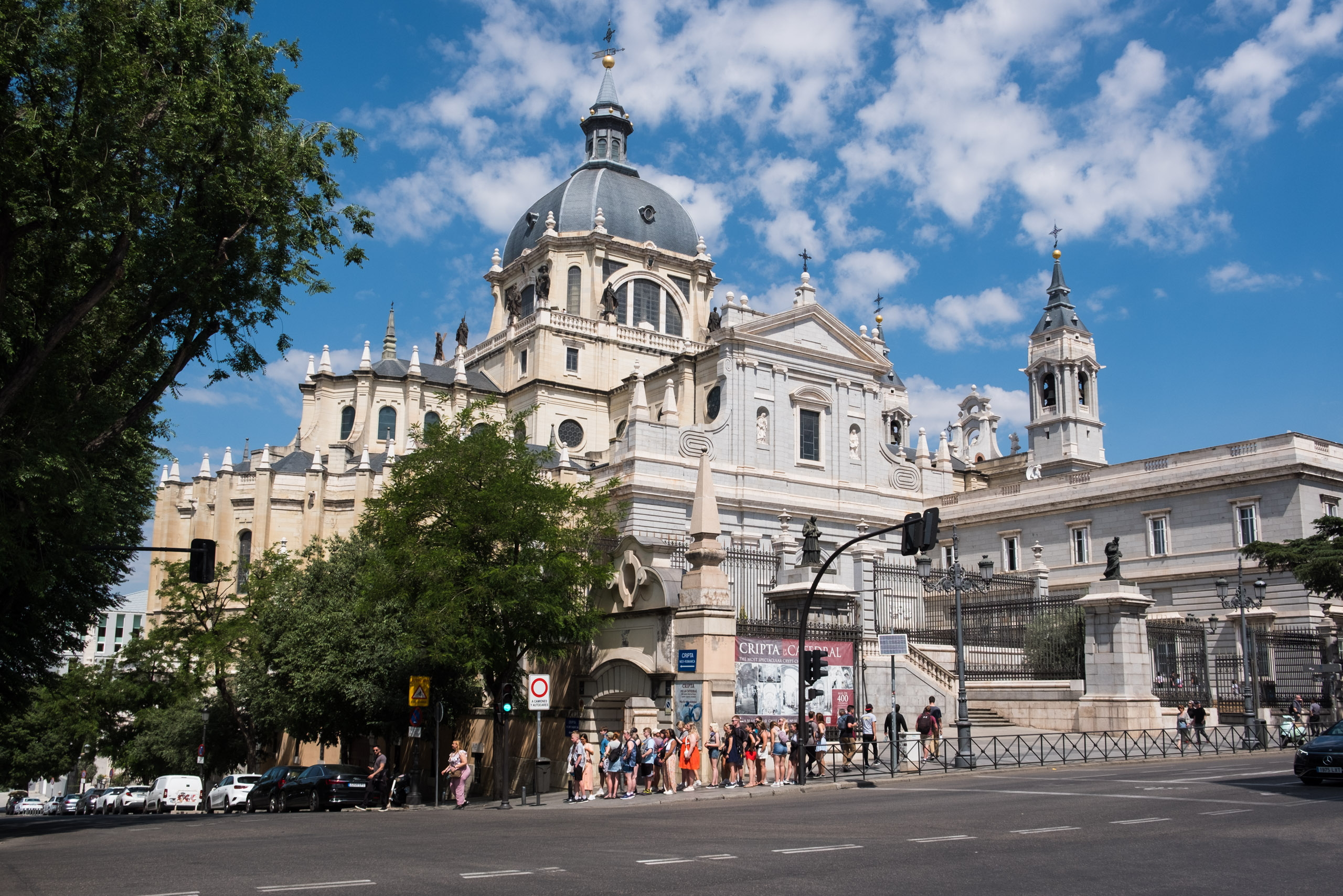 Unser eigentlicher Zielort war die “Catedral de Santa María la Real de la Almudena” und der “Palacio Real”. Wir begannen mit der Kathedrale. Die Catedral de Santa María la Real de la Almudena ist die Hauptkirche von Madrid und beeindruckt durch ihre neoklassizistische Fassade. Von außen ist sie ein imposantes Bauwerk, das die Skyline von Madrid dominiert. Innen wirkt sie jedoch etwas weniger prunkvoll als andere Kathedralen, die wir besichtigt haben, wie beispielsweise die Kathedrale in Mailand.