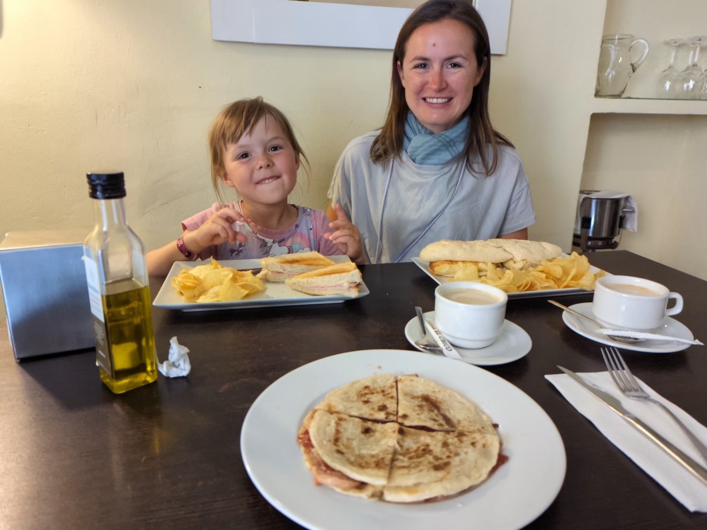 Doch zuvor rief der Hunger. Um kurz vor 7 Uhr morgens wollte keiner von uns so richtig ausgiebig frühstücken. Wir fanden ein nettes Lokal, das augenscheinlich von vielen Madrilenen besucht wurde. Hier gab es neben einem einfachen Toast für Sammy eine leckere spanische Tortilla und eine Quesadilla mit Leberpastete, Schinken und Quittengelee. Gestärkt und doch voller als geplant ging es danach weiter.